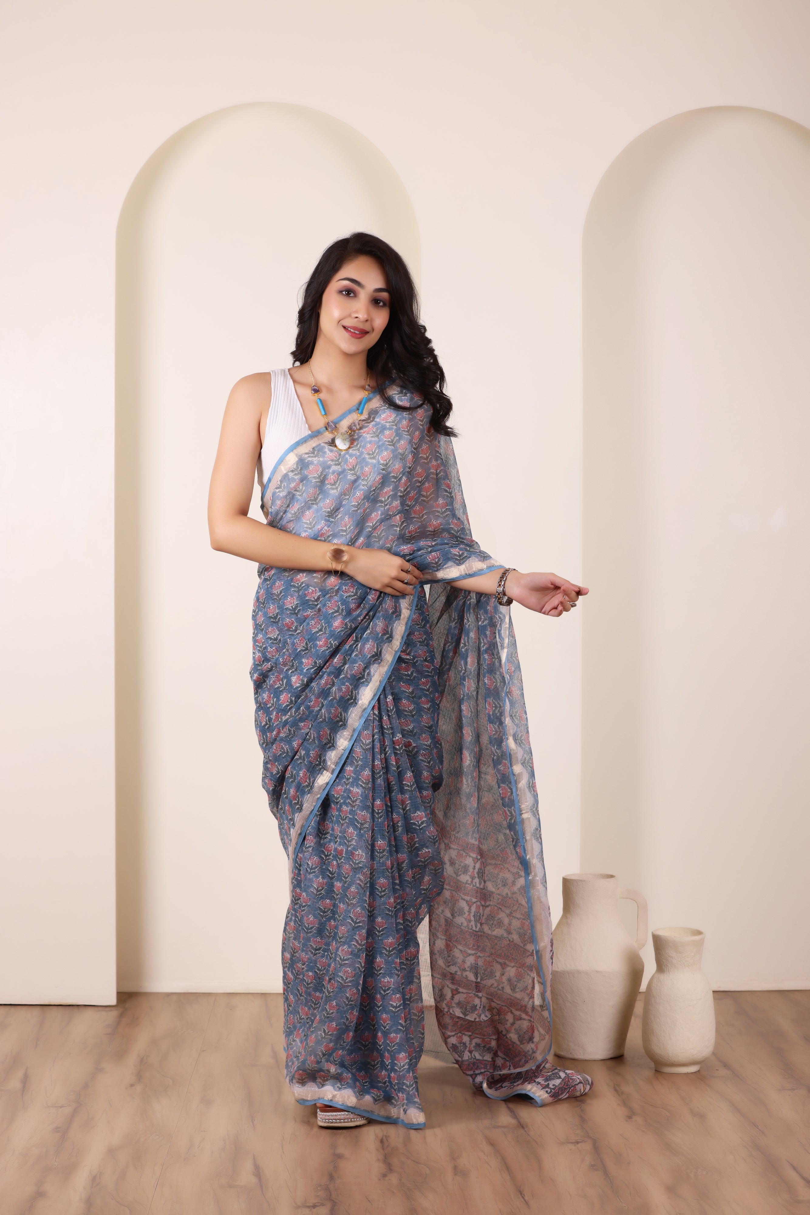meticulously handwoven in Rajasthan using cotton. Known for its lightweight texture and airy feel, this saree is ideal for everyday elegance, cultural occasions, and summer styling.