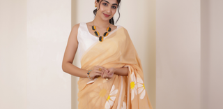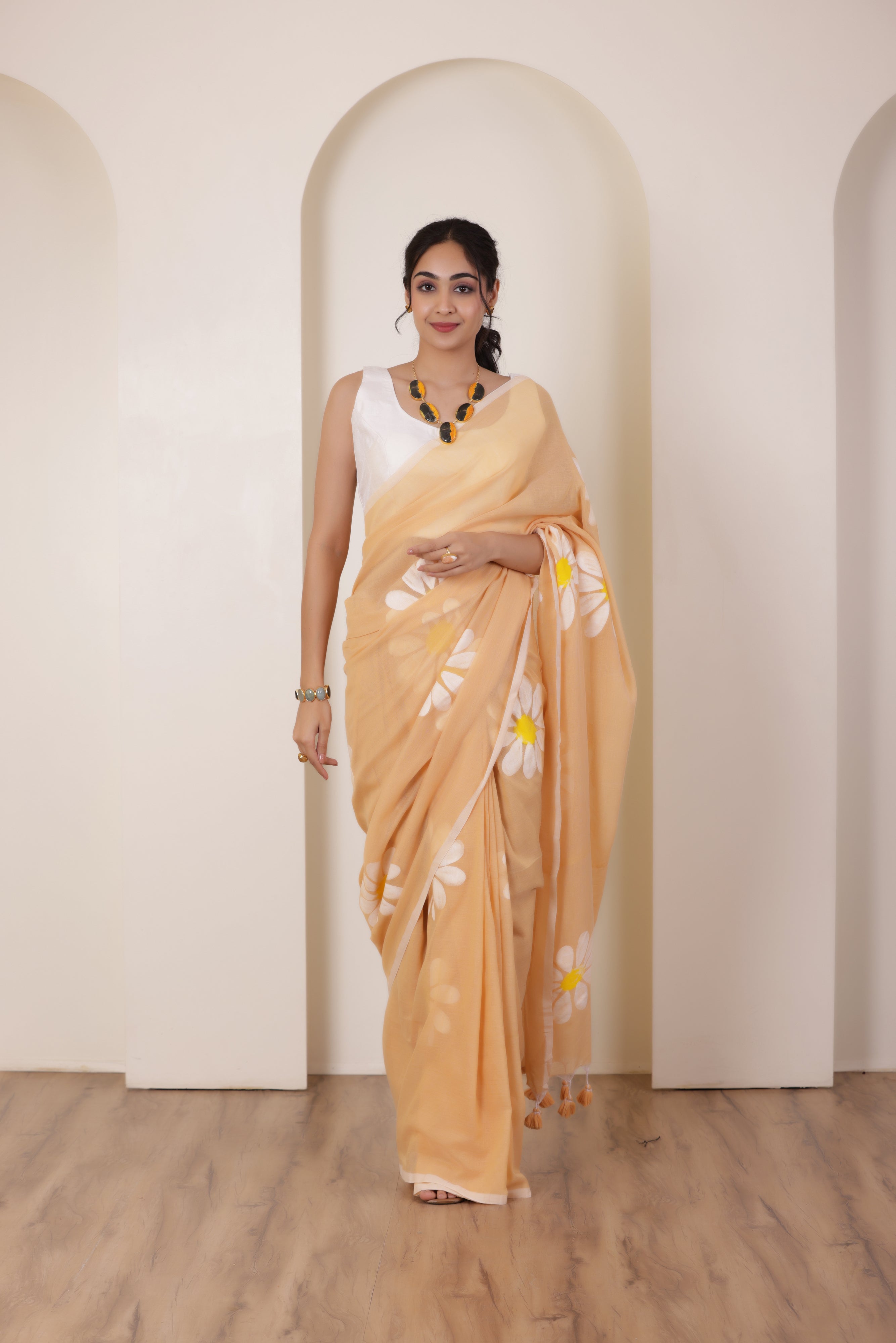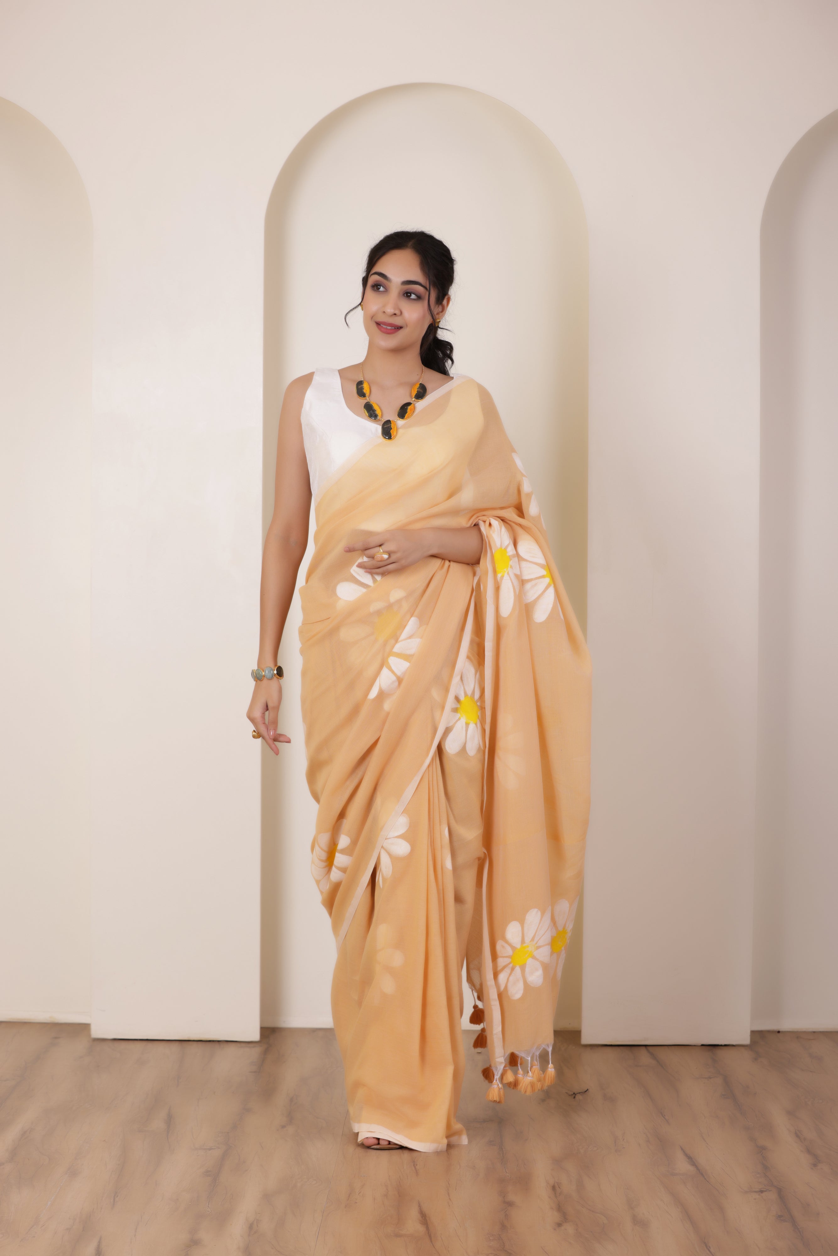 DAISY BLOOM HAND PAINTED KHADI COTTON SAREE IN SANDAL WITH DAISY DETAILING