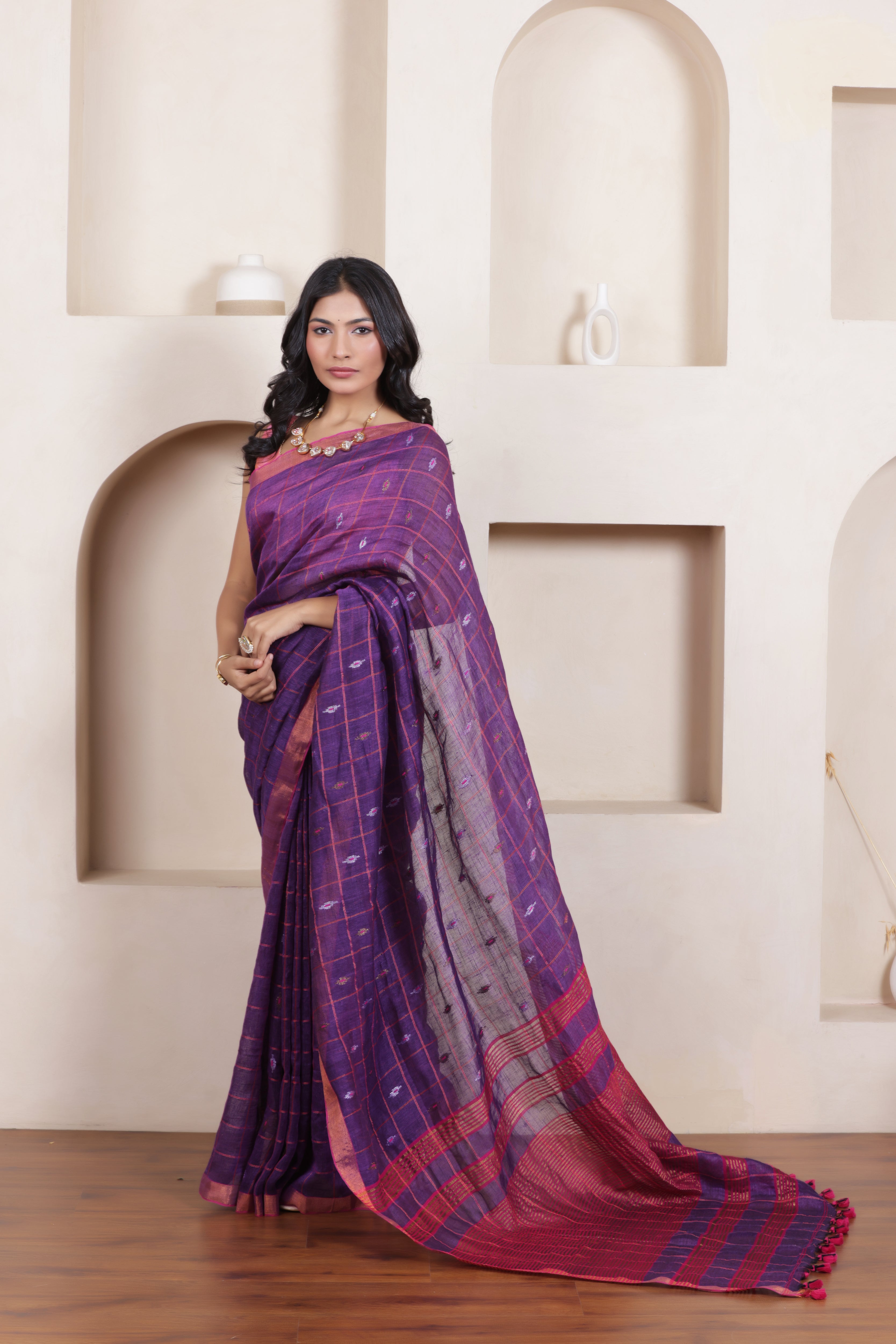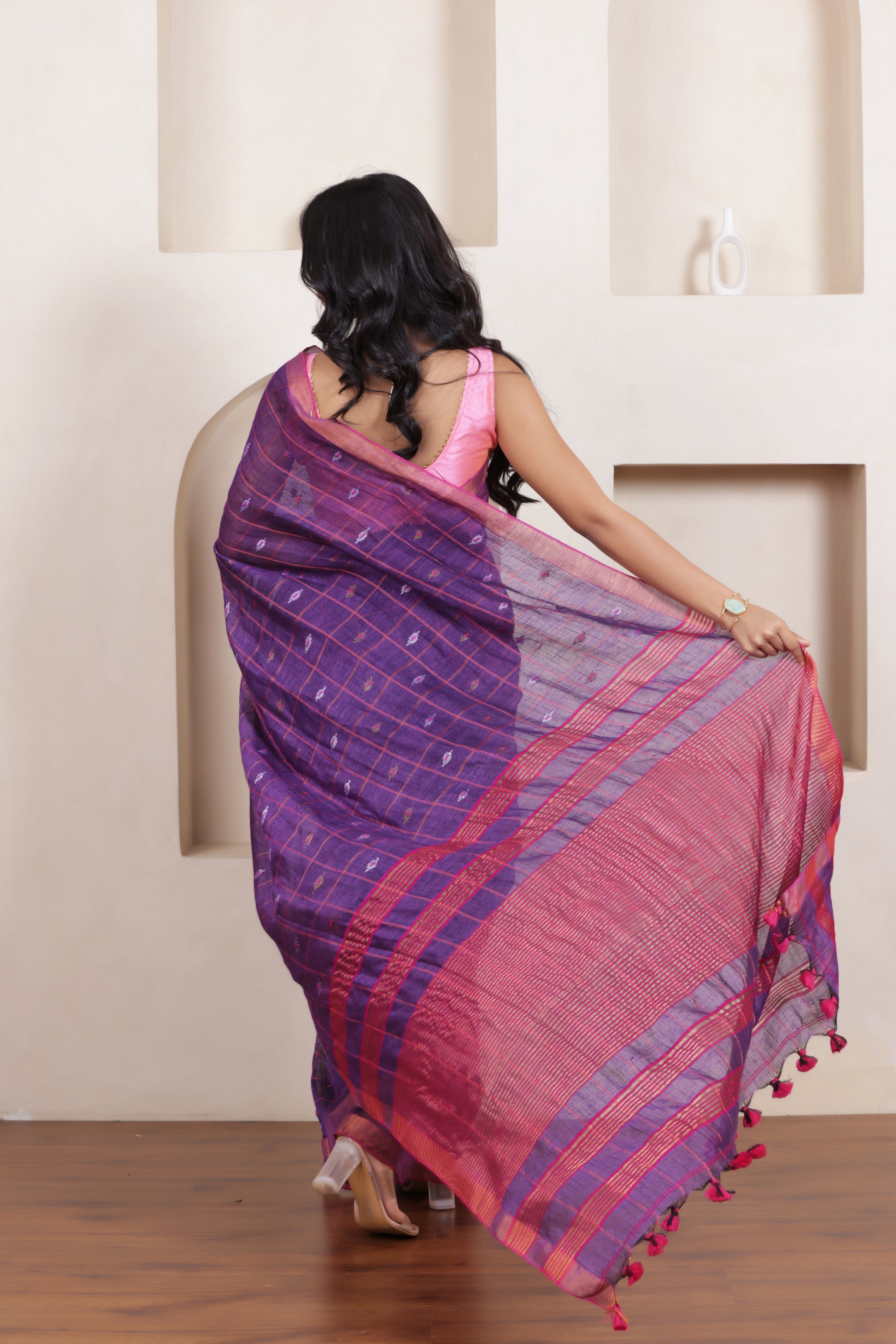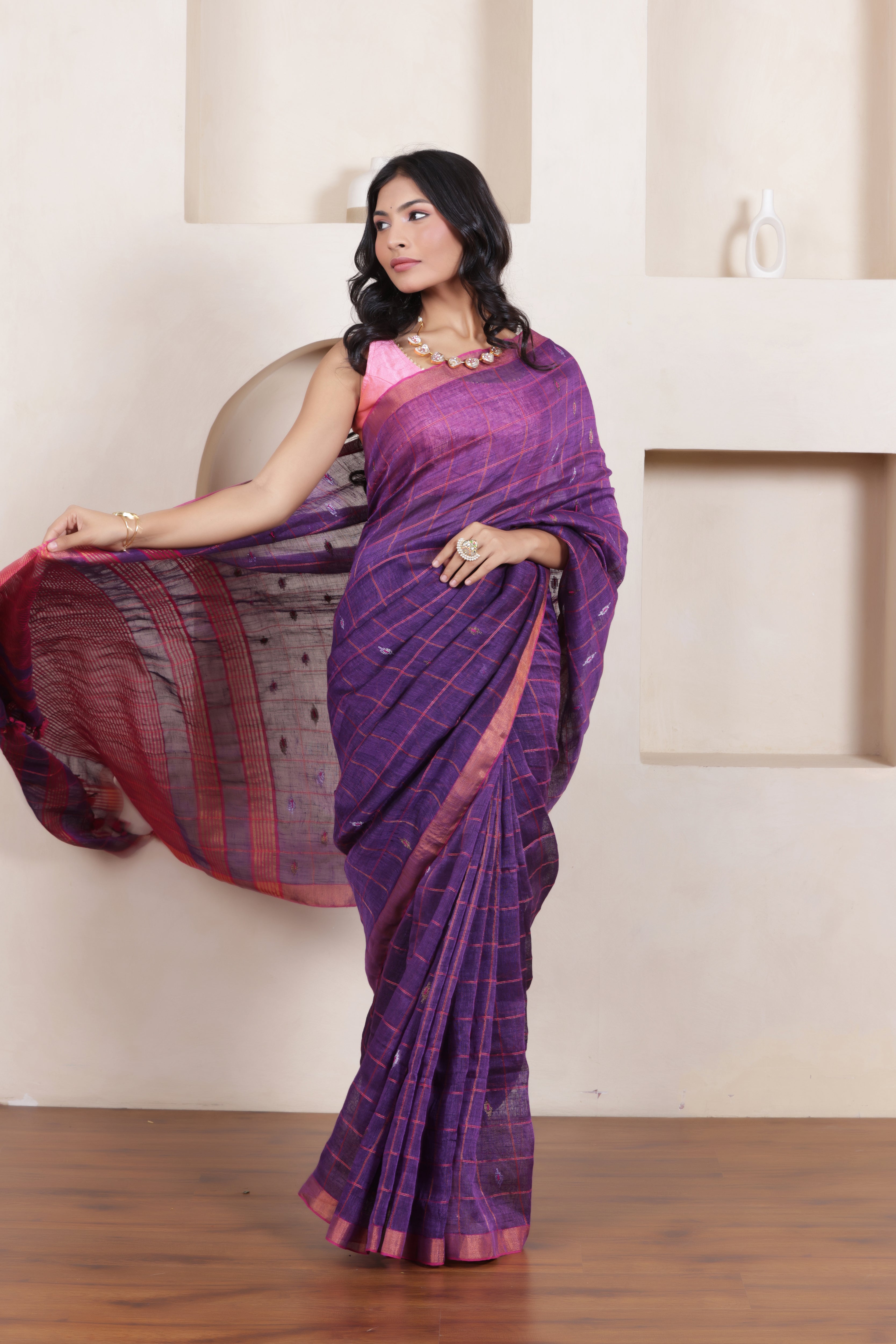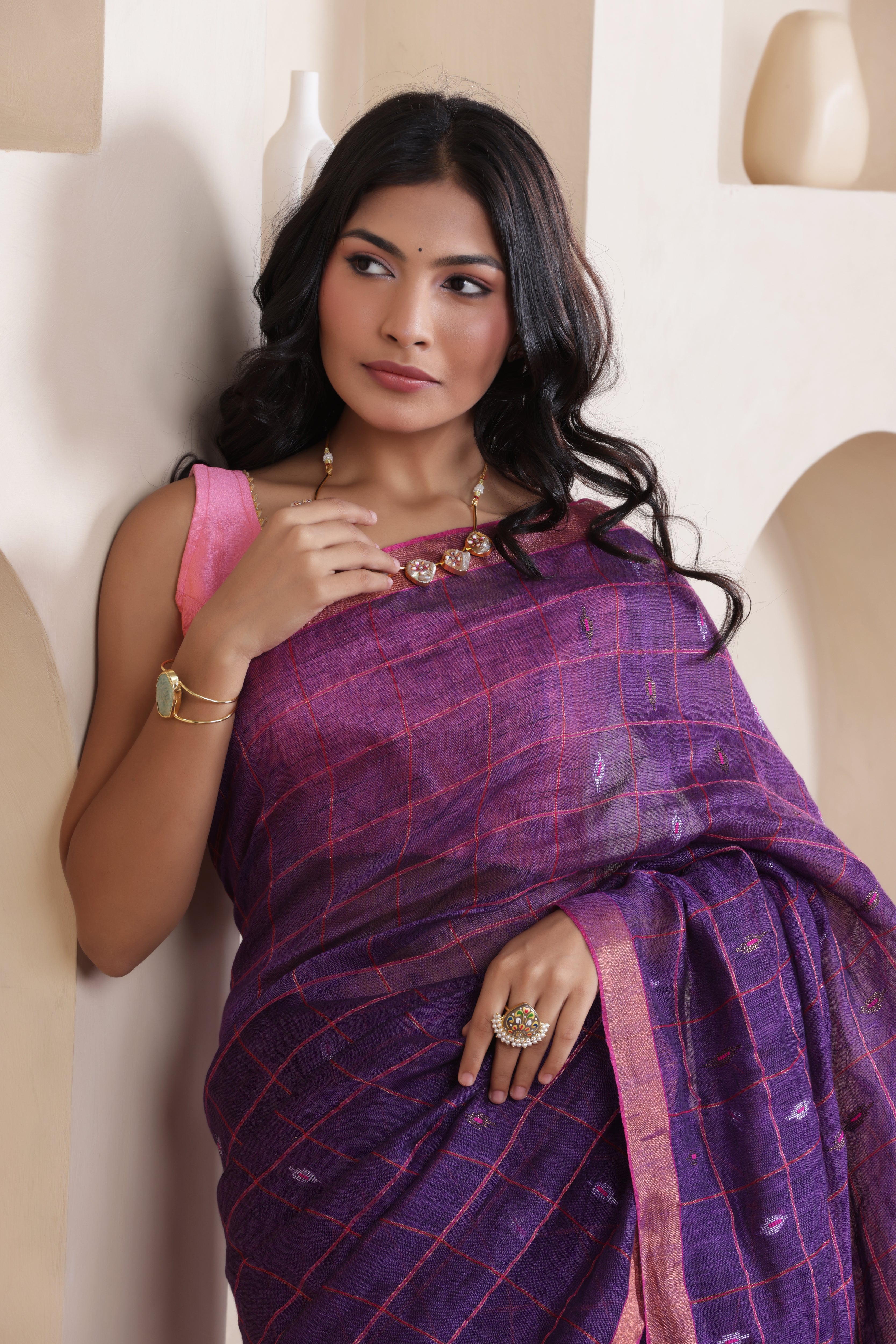 CLASSIC VIOLET GRACE LINEN CHECKS SAREE WITH WOVEN BUTTAS