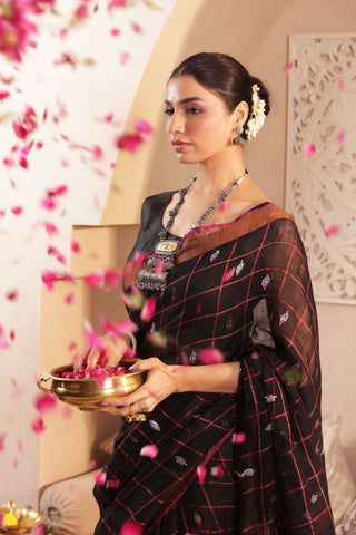Step into timeless elegance with this exquisitely crafted linen saree, featuring a harmonious blend of checked patterns and delicately woven butta motifs. The rich, handwoven texture is enhanced by subtle zari-lined checks, while intricate thread buttas add a touch of traditional artistry. Lightweight and breathable, this saree is perfect for festive occasions, cultural events, or sophisticated daily wear. Finished with a contrasting pallu and elegant tassels, it strikes the perfect balance between classic charm and contemporary grace.